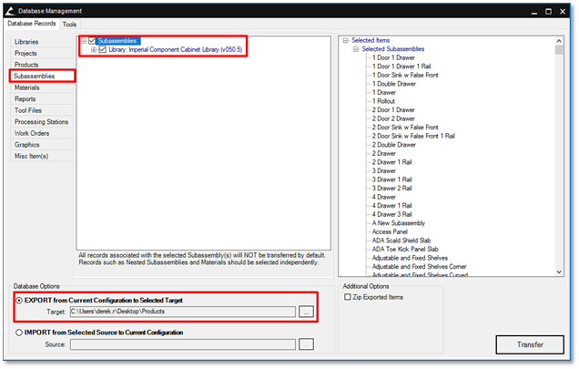 All records associated with the selected Subassembly(s) are NOT transferred by default. Records such as Nested Subassemblies and Materials should be selected independently.