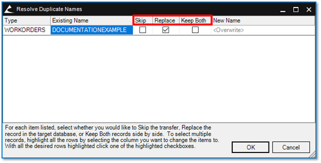 When the file being exported to is empty, or lacking a MicrovellumFactory.sdf database, a database is automatically created with the exported data inside. When the file being exported to already has a MicrovellumFactory.sdf database, and this database features duplicate information, the Resolve Duplicate Names window appears. When there is no duplicate information, the data being exported is appended to the database.