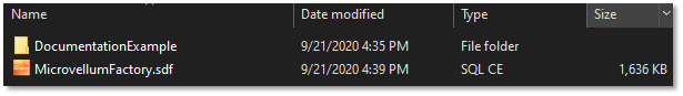 A MicrovellumFactory.sdf database file is created containing the work orders exported and various other tables of data. A folder is also created for each work order being exported within the folder selected containing the batches, nest drawings, G-Code files, DXF files, and individual work order databases.