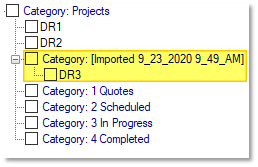 When a project is imported, an import category is added that contains the Project. This appears in the tree-view: