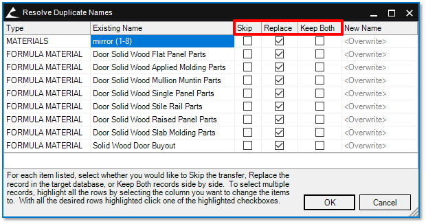 When importing from a database that includes data duplicated from the Factory Database, like an archival database, the Resolve Duplicate Names window appears.