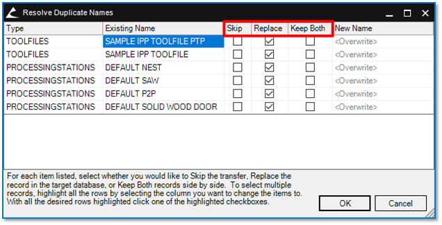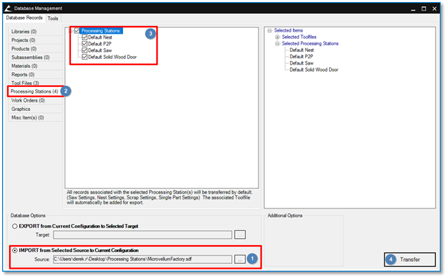 All records associated with the selected Processing Station(s) are transferred by default. These records include Saw Settings, Nest Settings, Scrap Settings, and Single Part Settings. The associated Tool file is automatically added.