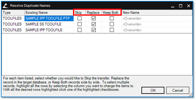 - The middle panel is populated with data from the selected database. Select the Tool File(s) to be imported from this central panel.