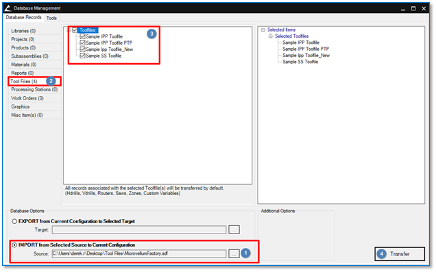 All records associated with the select Tool File(s) are transferred by default. These records include HDrills, VDrills, Routers, Saws, Zones, and Custom Variables.