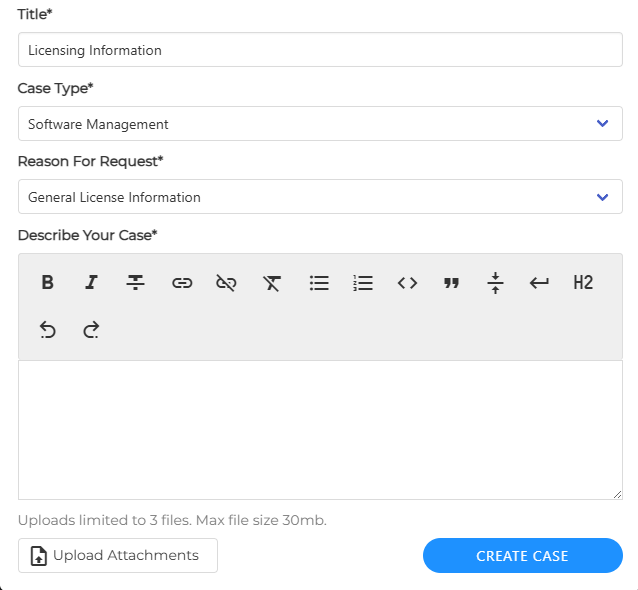 - From the "Case Type" drop-down menu, select “Software Management”, then "General License Information" under the "Reason for Request" field.