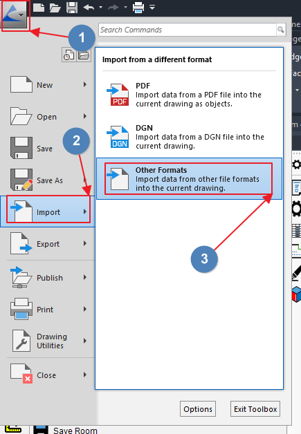 - On the Quick Access Toolbar in the upper left corner of the CAD design screen, click the button with the Microvellum icon (File), Import/Other Formats.