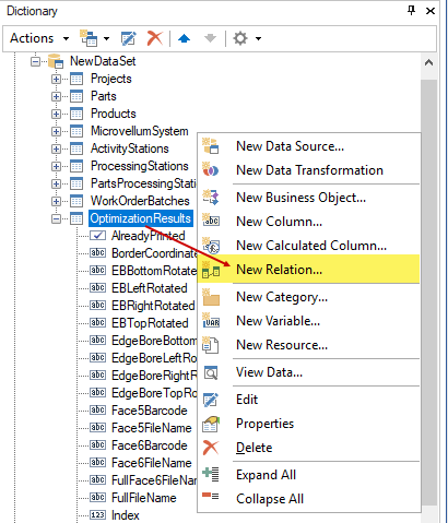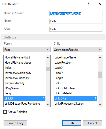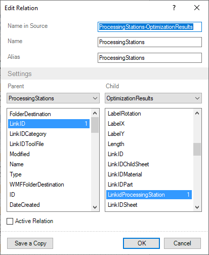 - Add two relationships from OptimizationResults, one to Parts as the parent, and one to ProcessingStations as the parent.