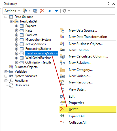 - Delete the dataset table PartsProcessingStations from the report dataset.