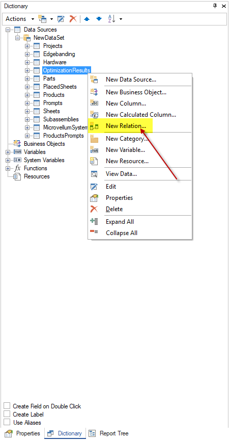 - Right-click the dataset table for OptimizationResults and click “New Relation.”