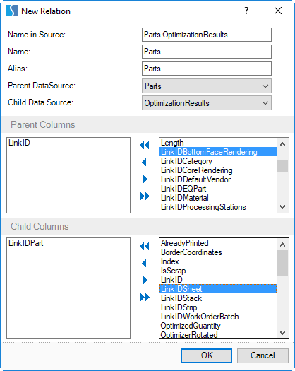 - Select “Parts” for the Parent DataSource property. The property for Child Data Source should already contain “OptimizationResults” if the steps above were correctly completed.