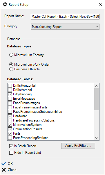 - In the Report Setup screen, name the report as needed. Click the options button for “Microvellum Work Order” and make sure there is a checkmark next to OptimizationResults. Lastly, set the property “Is Batch Report” to True and click OK.
