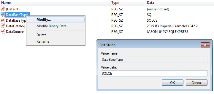 Right-click on "DataBaseType" and "Modify" – change "SQL" to "SQLCE" – restart the program.