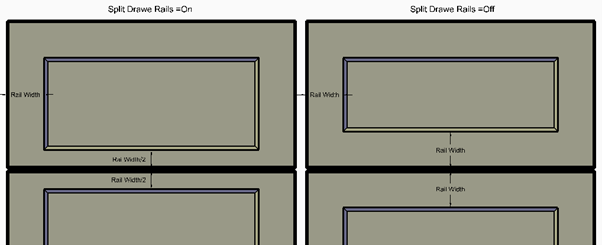- Split Drawer Rails - Tick to have split drawer rails. This is used for drawer fronts so you can have internal rails between doors be split height so the rail width on both drawer front will be half the rail width. Note: This will only work if the prompts have been linked to the internal profiles in the lookup table.