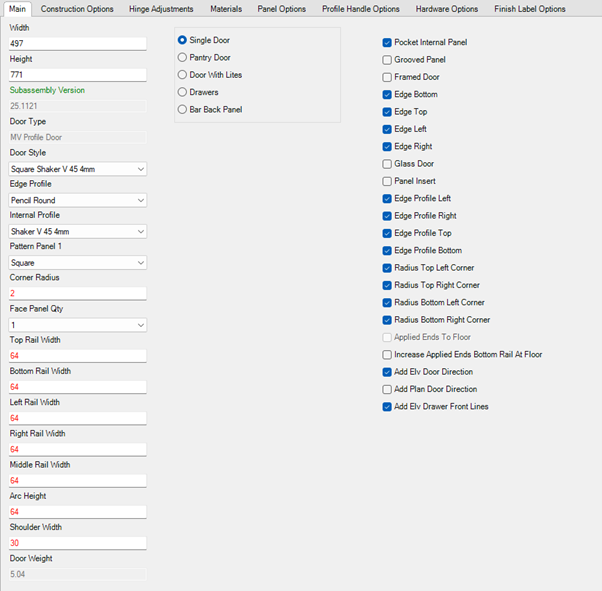- Add Rail Lines - Tick to add rail lines on the door face. Used to make the door look like a 5pc door. Note: This will only work if the prompts have been linked to the internal profiles in the lookup table.