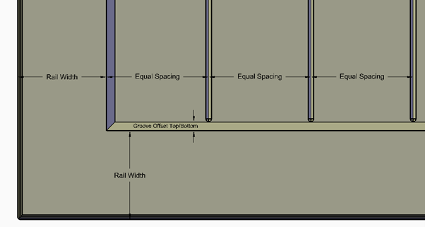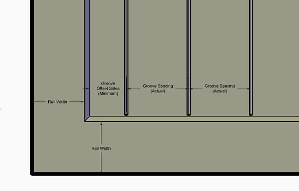 - Equal Spaced Grooves – Use this option if you require the grooves on the panel faces to be equally spaced. The distance between grooves will now act as a target spacing. Unticked the spacing will adhere to the actual Default Groove Spacing, the remainder with be at either side of the panel.