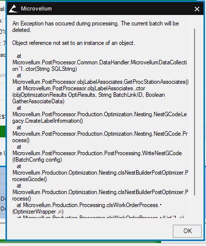 Fig. 5: The nesting error occurring with specific tool files.- Certain processing stations and tool files were reportedly having difficulty fully processing a work order. When trying to complete an operation using specific nesting tool files, it was sometimes the case that the operation would experience an error, causing the current batch to be deleted. This issue has been resolved; this error should no longer occur when processing work orders.