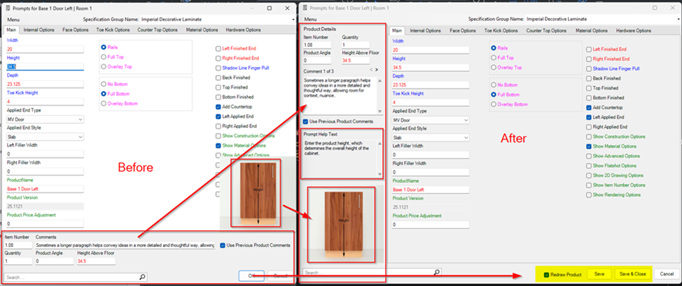 - Changes can now be saved without closing the UI. Additionally, a checkbox (“Redraw Product”) has been added to allow one to control whether the product should be redrawn when its prompts have been altered and saved.