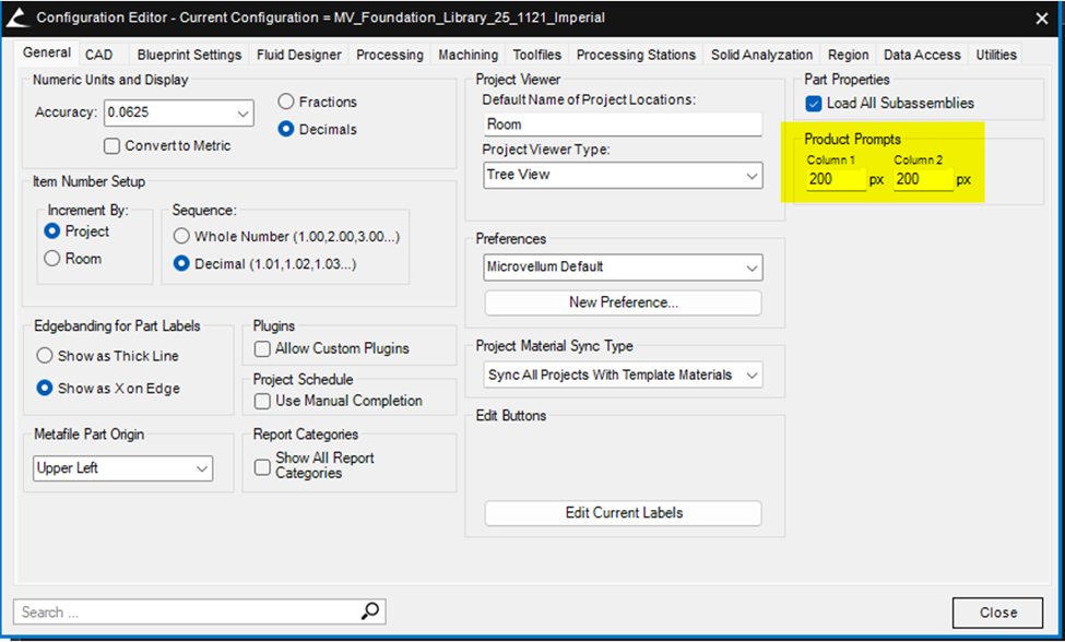 - There is now a setting under Microvellum Settings > Options > General called Product Prompts, which controls the width of Columns 1 and 2.