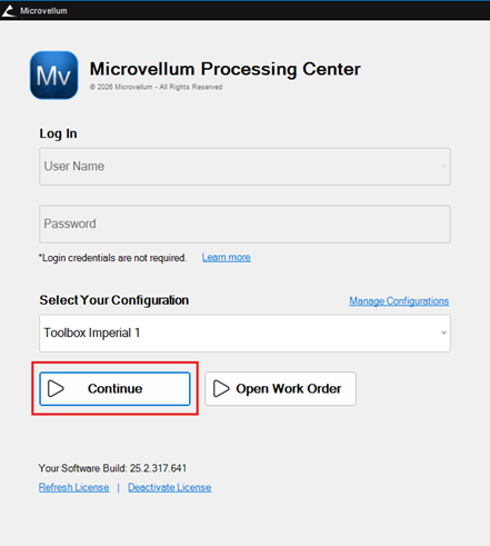 - The Processing Center standalone application is now capable of being opened without requiring a work order to be loaded within the software. A new “Continue” button has been added to the login UI of the application to allow users to open the application without first loading a work order.
