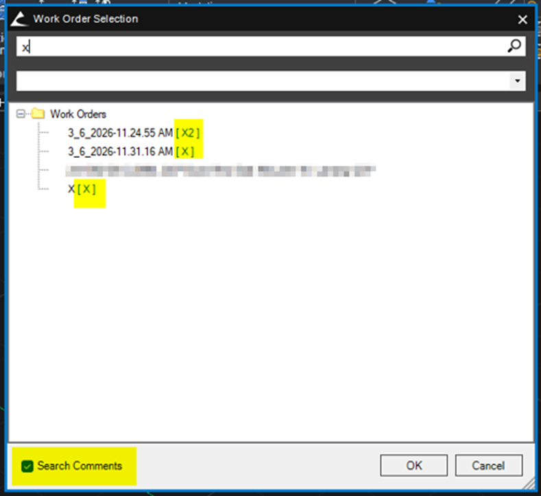- When searching through large work order databases, it can sometimes be difficult to navigate or locate specific information due to the presence of many comments within multiple work orders. To resolve this issue, a new filtering feature has been added to the Work Order Selection interface when modifying an existing work order. This checkbox, “Search Comments”, places a filtering for specific text entered in the Search Bar, allowing users to search for specific words or characters within comments of their work orders, to better locate specific work orders within one’s database.