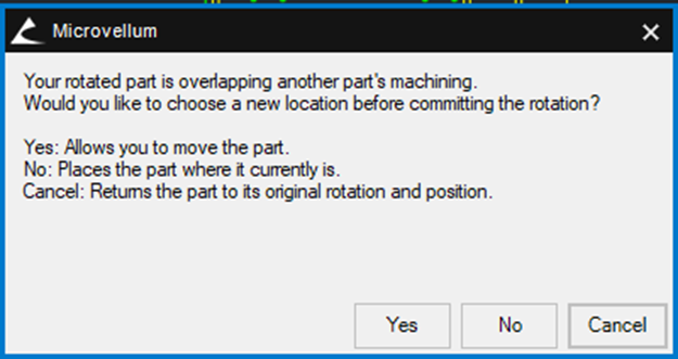 A warning has been added to the nesting tools when a part that has been moved is set to overlap with another part. When a part is detected to overlap another part, a pop-up warning will alert users, and present the following options: