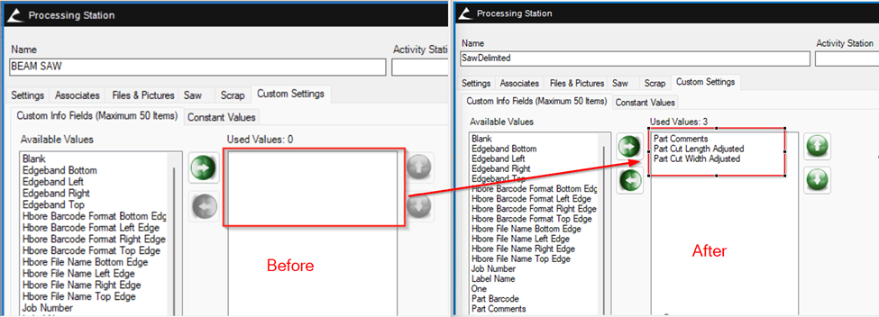 - Issues were reported with specific settings disappearing when viewing them in the processing station interface. Users who set their output type to “SawDelimited”, then assigned custom values to the saw and processed the work order found that while their custom values are visible in the XML file and processing, they would not appear in the Saw Processing Station when reopened so it appeared blank, leading to confusion. This issue has been resolved - custom values assigned to saws should appear appropriately within the values column.