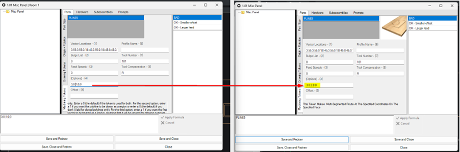 - An Offset Polyline issue was reported wherein extra vectors (and thus, routes) would be incorrectly added to 2D drawings, causing incorrectly shaped parts. This issue has been resolved- a coding fix was applied to enhance the software’s ability to determine whether a route is a pocket. Additionally, the default value of parameter 4 in the PLINE5 machine token has been modified from 3;0;1;0;0 to 3;0;3;0;0.
