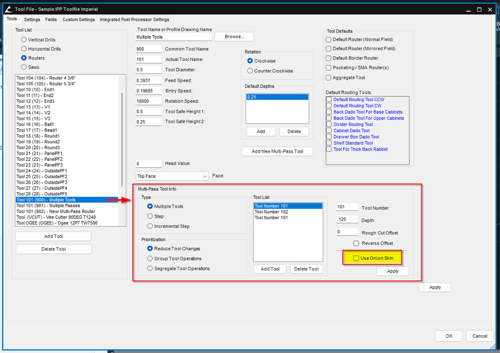 - Previously, when using 900-series tools (multiple tools or multi-pass tools), the software was unable to support the use of the Leave Onion Skin option within Small Part Handling (leaving a thin layer of material from the first cut of a double pass for the second cut to remove). This has changed in this update, with a new checkbox, “Use Onion Skin” being added to Toolfiles when selecting a 900-series tool. This new checkbox will not function unless the “Leave Onion Skin” option in the Small Parts Handling section of the Processing Station is enabled simultaneously. When a 900-series tool is used as the Nest Border Tool and if both checkboxes are enabled, the final pass of a tool will leave the specified onion skin thickness rather than machine to full depth.
