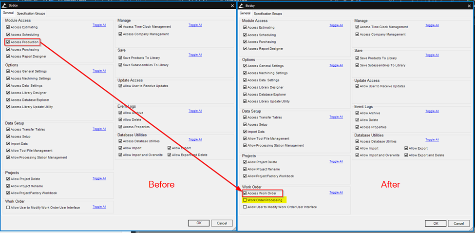 - Additionally, the “Access Production” setting within the Module Access section has been renamed and relocated. This checkbox allows the employee in question to log into and utilize the functions of Microvellum Production and the Processing Center as a whole. The setting has been renamed to “Access Work Order” and moved to the Work Order section of the Employee Permissions interface.