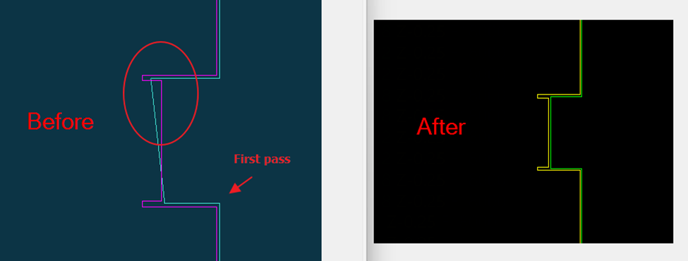 - A related issue was reported wherein users would have vectors of their routing machining drop during processing. Notedly, this would only occur when processed with the Machine Cannot Offset Routing (MCOR) setting enabled. This has been resolved.
