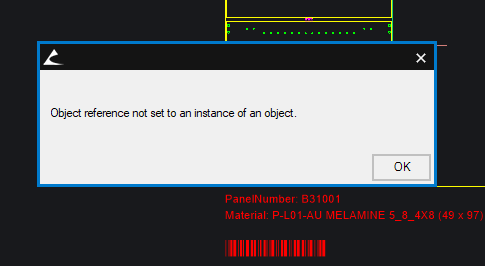 Fig. 2: The object reference error upon updating a part. - When changing the processing station during nest editing of a composite, it is expected that parts will update to reflect the changes in processing station rules. However, some users instead experienced an object reference error, preventing the part from being updated properly. This issue has been resolved- this error should no longer occur when attempting to update a part and changing processing stations should result in the expected changes in the composite.