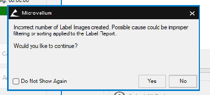Fig. 1: An error noting an incorrect number of Label Images. - An issue was reported wherein creating new G-code from an existing work order that was edited using nesting tools would prompt an error. Users specifically would receive an error stating that there was an incorrect number of label images. This issue has been resolved- the error should no longer appear in new work orders. However, it should be noted that while this issue has been resolved for new work orders, existing work orders with this issue may still have this problem occur. It is thus recommended to recreate and re-process any work orders that have prompted this issue.