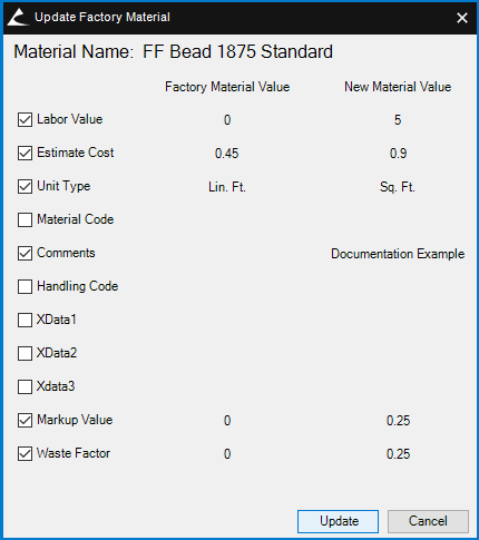 - Update Factory Material – If edits were made to the sheet from the Edit Selected Sheet interface, selecting Update Factory Material opens a window showing these new values and the Factory Material Values. Selecting the checkboxes next to the parameters that have changed, and clicking update updates the material at the factory level. See Figures 10 and 11.