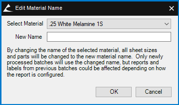 By changing the name of the selected material, all sheet sizes and parts are changed to the new material name. Only newly processed batches use the changed name, but reports and labels from previous batches could be affected depending on how the report is configured.