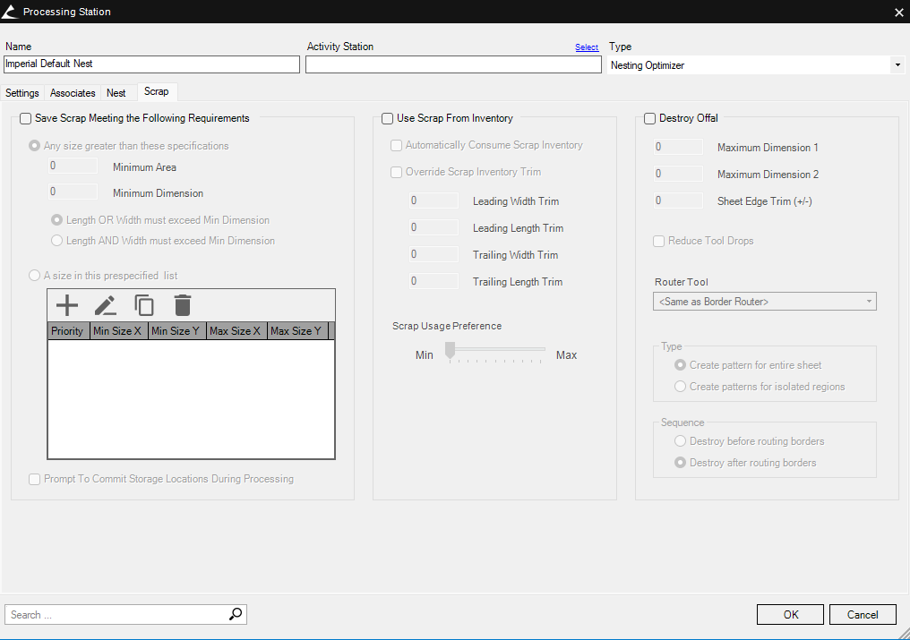 - Save Scrap Meeting the Following Requirements – Allows you to set up parameters that will allow the nesting optimization to create scrap “parts” when enough space is available. You can set up the parameters to use a minimum area and/or dimension. Or, you can set up the parameters to create parts based on a list of sizes. You can also turn on the option to have the system prompt you to commit scrap to a storage location during processing; otherwise, this will be a manual operation to be performed after processing.