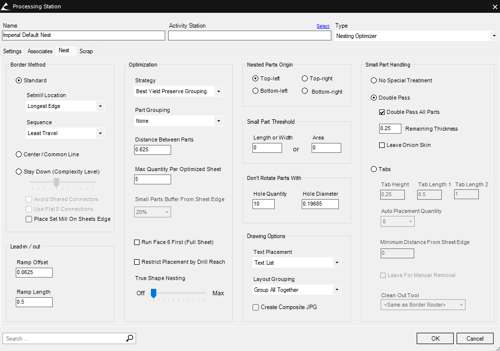 - Small Part Handling – Allows you to set up how small parts will be handled. Options include performing a double pass or using tabs (See Nest Tabbing for more information).