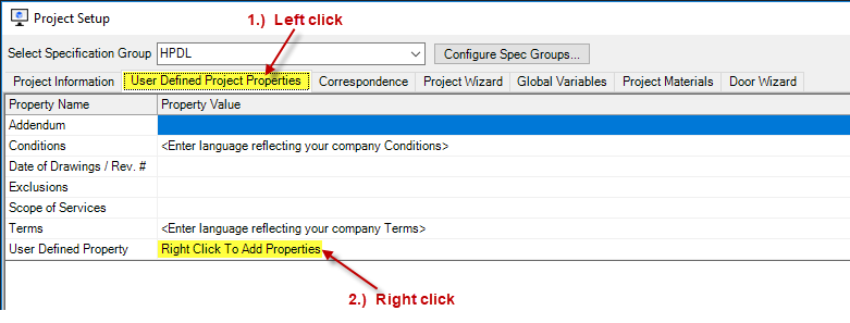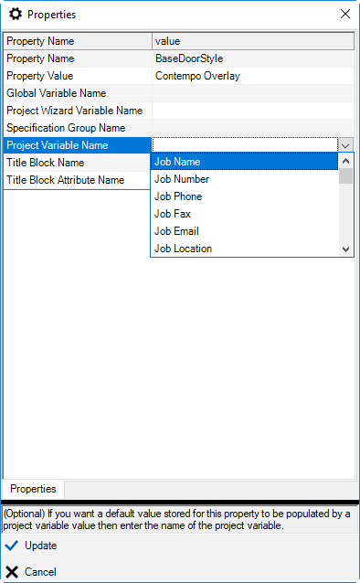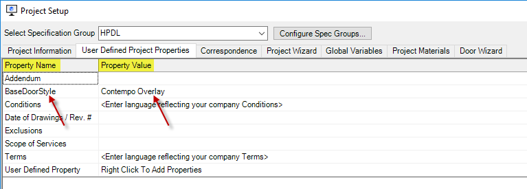 Click "User Defined Project Properties" and right-click in the Property Value column of the row User Defined Property. In this tutorial, we want to add a project-level property that we will use to enter the base door style.