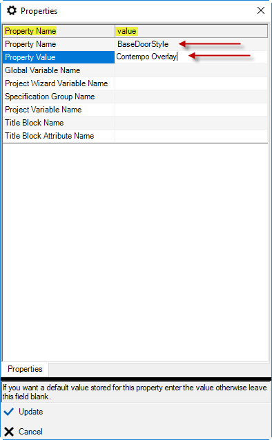 Click in the Value column for the row Property Name and enter “BaseDoorStyle” for this example. This is the name of your custom property and should be the name you select for your custom property. This is required data.