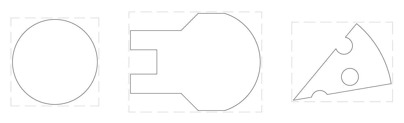 If the part is not rectangular (e.g. circular, pizza slice shaped, irregular polygon), the program calculates the yield based on the dimensions of a virtual bounding box enclosing the shape. The bounding box is the smallest rectangular box with edges parallel to the sheet perimeters that surrounds all points of the actual part. See figure one below for a few examples.