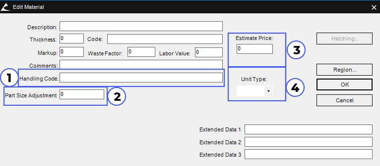Figure 7: Additional fields for solid stock/edgebanding/buyout materials.- Handling Code - The material level handling code utilized by material management systems. This is not the sheet level handling code, which is used in sheet stocks and is placed on a sheet-by-sheet basis. (For further information, please consult the Material Handling Codes article.)