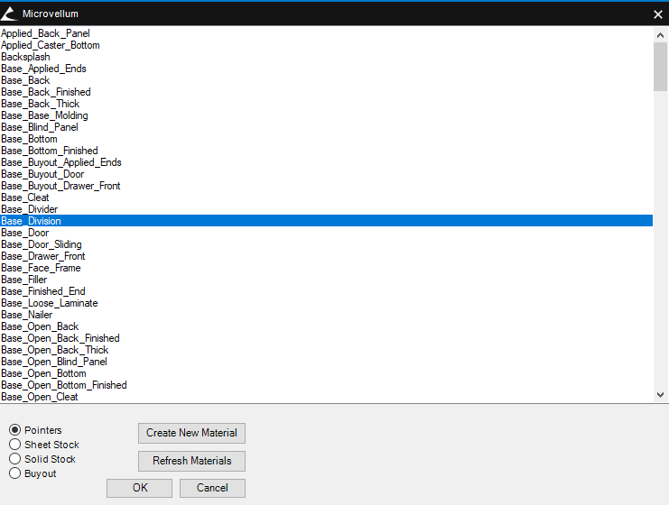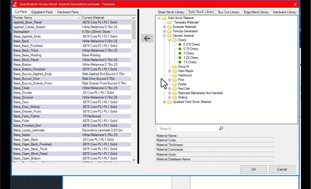 - The Solid Stock Library: Contains the list that come in solid form, such as lumber or moldings. The materials in this category operate under assumptions of being “raw” or largely unprocessed.