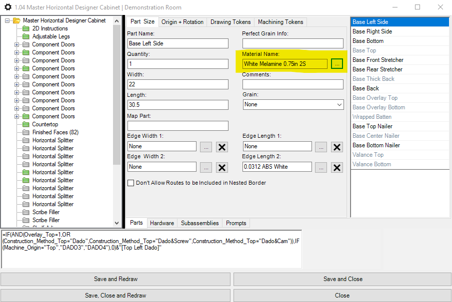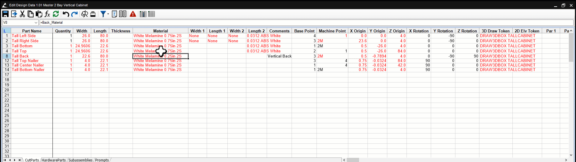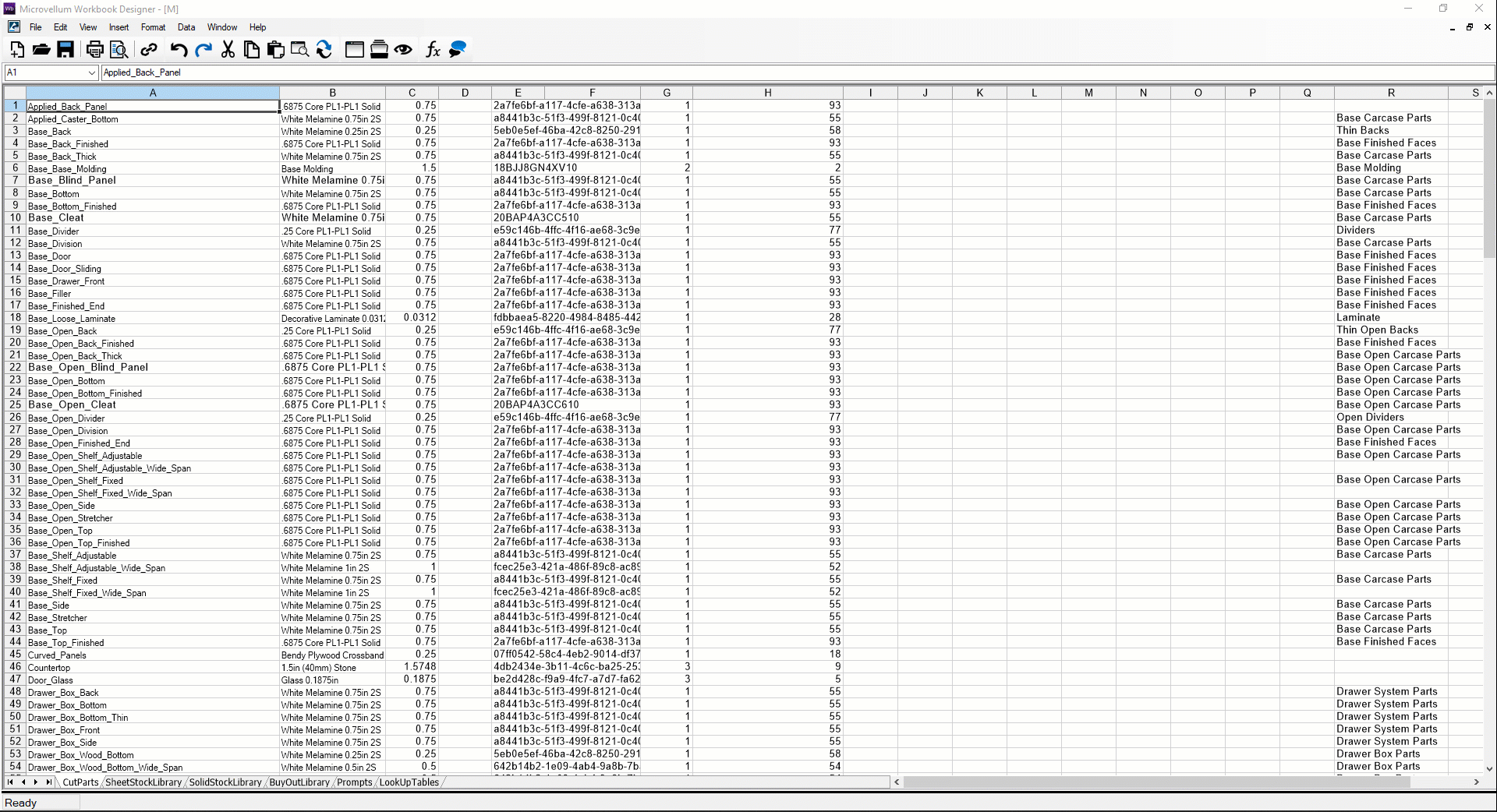 Within Toolbox, all materials are saved into the database, then assigned and sorted into one of the 3 major workbooks, based on which type of material they happen to be. This enables Hardware to be sorted into the H workbook, edgebanding into the E workbook, and the various stocks, buyouts, and other basic materials into the M workbook. Editing one's materials through the workbook designer gives one access directly to the formulas and pointers of the respective material libraries, including the pointers, allowing one to change the material assigned to specific pointers by altering the materials on a formula level, selecting different materials listed in different sheets or columns based on hypotheticals.