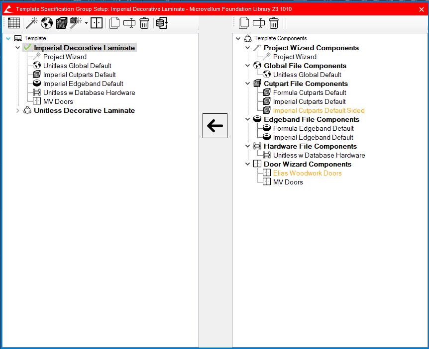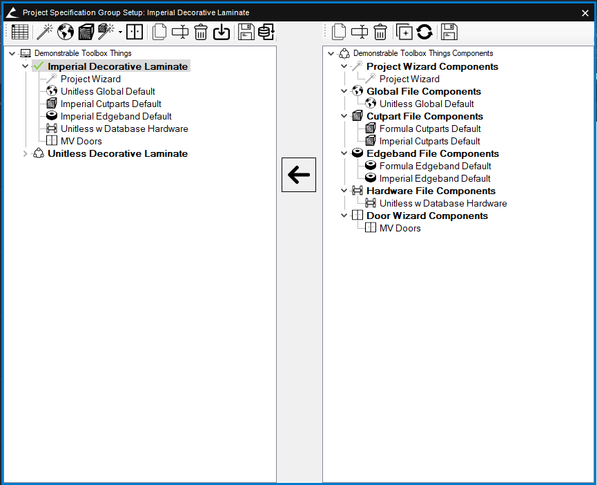 Figure 3: Library Specification Groups interface.- Pointers: Microvellum’s customizable material sorting system that allows users to set materials in their project or library as the standard, default material for specific parts of a product. These pointers can then be applied to product parts without requiring a great amount of sorting through the inventory, across multiple products. To apply a material as a pointer, one needs only to select the material within the material folders and files window, click the pointer they want to apply the material to, and click the arrow in-between the two windows. (For further information, please consult the Material Pointers Overview article.)