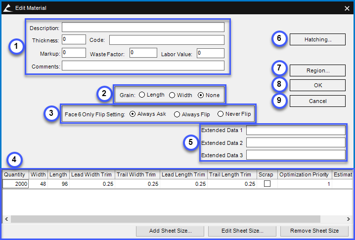 From the material submenu, users can edit the materials in their library or project, changing factors to best represent and track various attributes, such as thickness, face 6 machining, the total quantity of the material, dimensions, and more. From the material submenu, one need only click on "Edit Selected Material" (see above, #6) in order to open up the material editing interface.