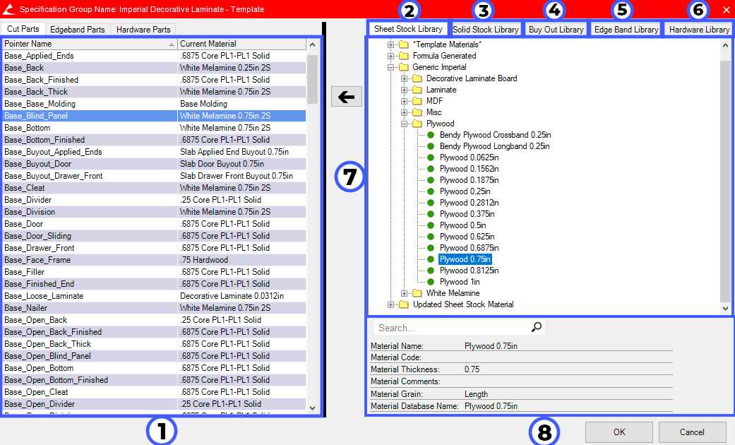 Project specification group refers to the materials, cut parts, and hardware that are specific to the currently opened project, whereas the library specification groups option contains and manages the materials, cut parts, and hardware present in the entirety of one’s Library, and as such, would apply across all projects and future projects. When a material is controlled on a library level, if one desires to alter or edit the material, it must be done by accessing the Library Specification Groups. The reverse is true for materials controlled on a project level, requiring one to open the Project Specification Groups.
