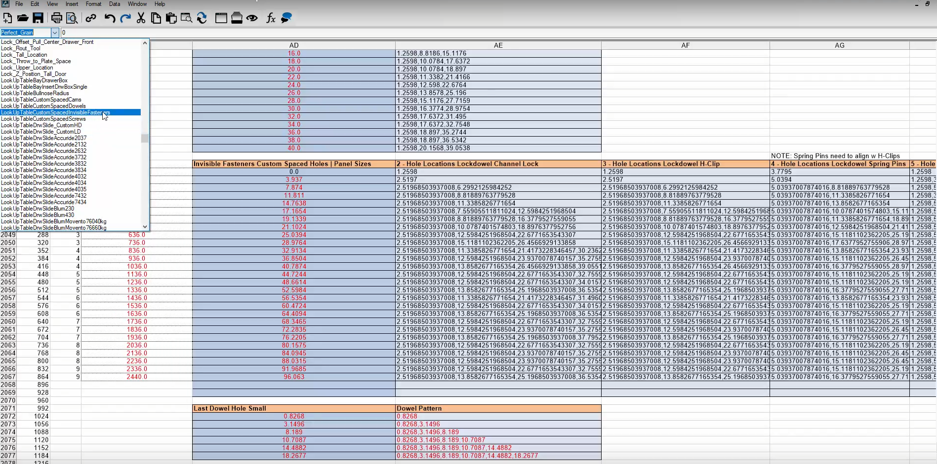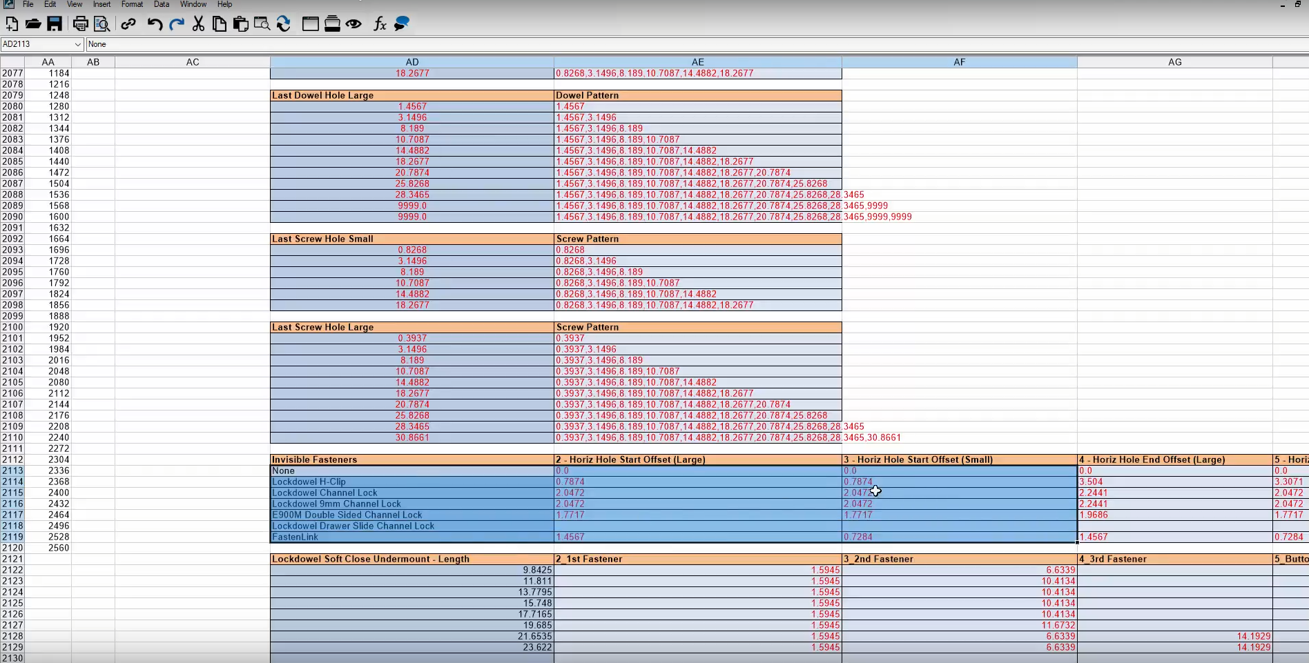 Column AE contains the 32mm spacing for the incremental part sizes. The larger the panel grows, the more 32mm holes are added. These spacing values may be modified if your company has differing requirements. You may add rows if more spacing combinations are required.