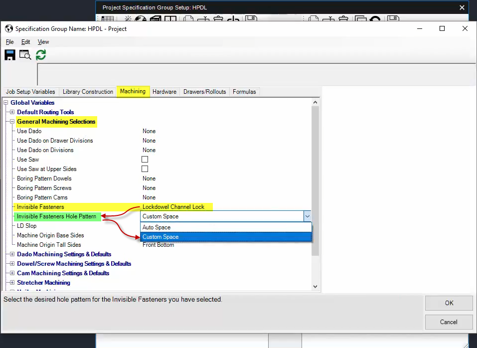 “Global Variables > Machining > General Machining > Invisible fasteners > Lockdowel Channel Lock > Invisible Fasteners Hole Pattern > Custom Space”