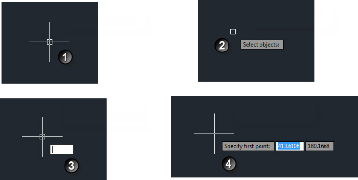 Model Space is where you will create your drawings. You interact with the Model Space by selecting objects or points with the crosshairs. The crosshairs will automatically activate anytime you are inside the Model Space. There are four types of crosshairs you will frequently use with Toolbox. First is the standard crosshairs, as shown below. This type is visible when no commands are active. Second is the Active Command Crosshairs. This type is visible when a selection command is active. The third is the Floating Command-Line. This type is visible when a command is active that requires keyboard input to continue. You can input values without selecting the docked command line. Fourth is an Active Draw Command Crosshairs. This type is visible when a draw command (such as the Polyline Command) is active and waiting for you to select a point on the screen.