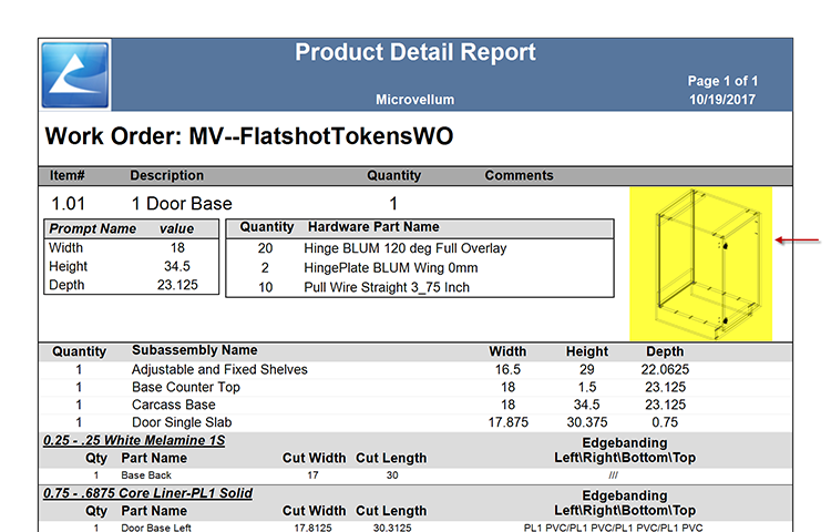 While using this new functionality, keep in mind that the reports will reflect the dynamic product image, and AutoCAD will draw them only when the library data contains the flatshot tokens. The default Microvellum build 046.2 Component Cabinet Library contain those tokens and can be used as a template for modifying an existing library, or for future products.