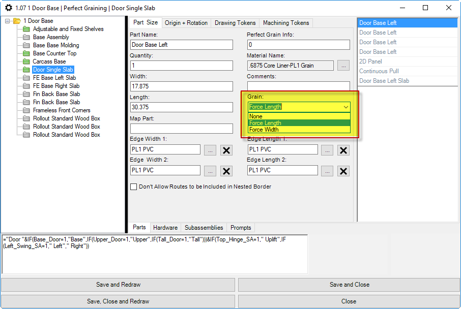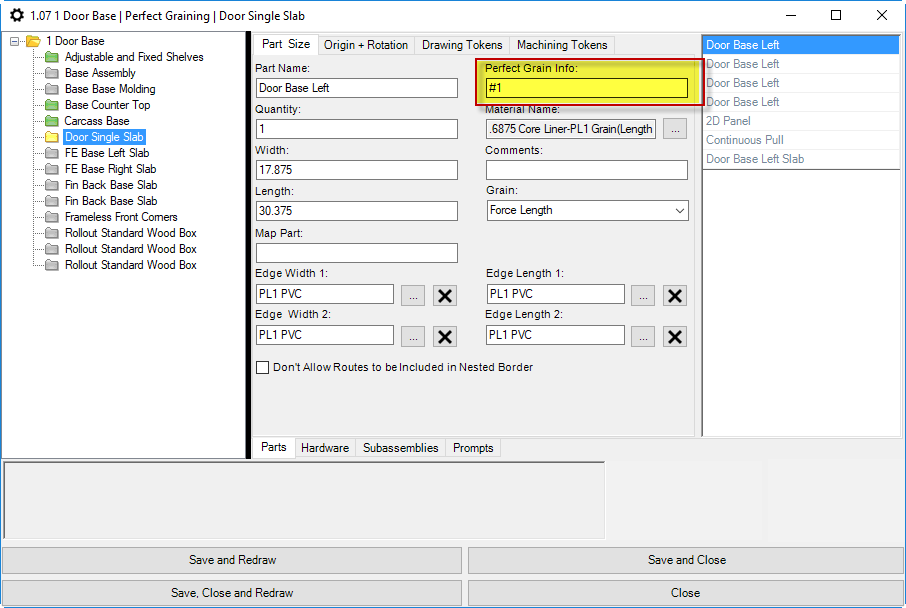 For example, you have a One Door Base, and an adjacent 2 Door 2 Drawer Base that you want to be included in the same perfect grain grouping, enter a #1 in the Perfect Grain Info box of all the doors and drawer fronts of those two cabinets. Then, if you have a 1 Door Upper and a 2 Door Upper that you want to be included in a second grouping, enter a #2 in the Perfect Grain Info box of all the doors of those two cabinets.